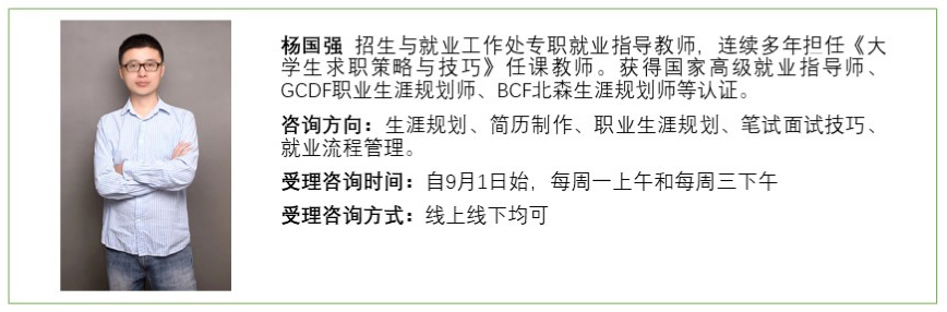 1. 本学期“一对一”生涯发展与求职就业个性化咨询服务将于9月1日(周一)正式开始,欢迎同学们预约。后续咨询相关通知更新,请留意“华大就业汇”微信公众号。