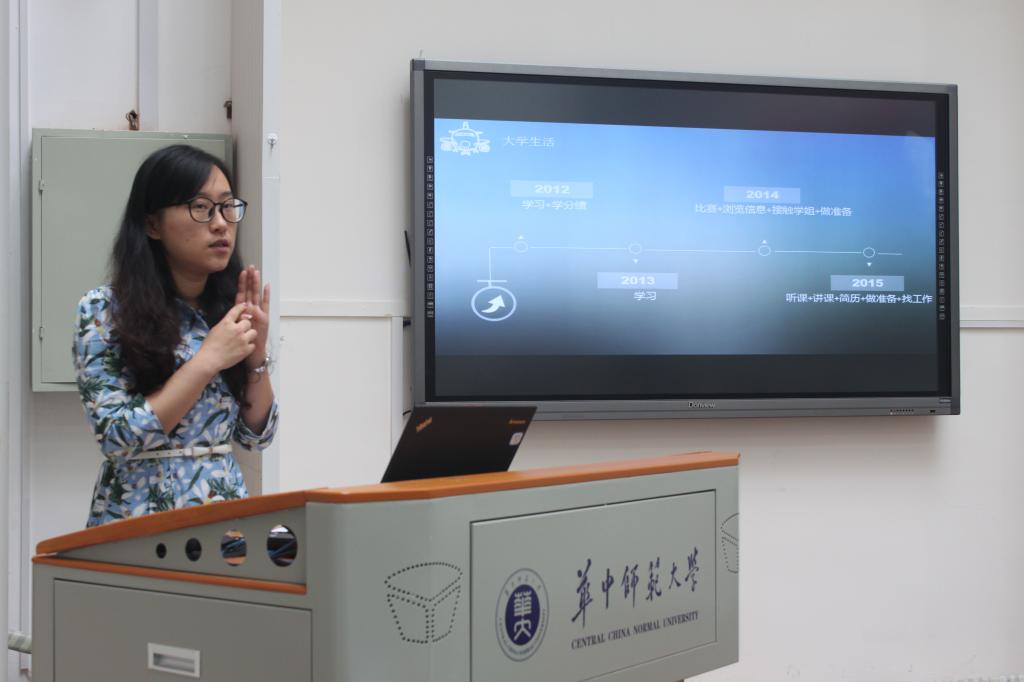 在随后举行的“圆梦教育”专场分享会上,签约湖南省岳阳市第一中学的城环学院本科毕业生陈文琪、签约华中科技大学附属中学的文学院本科毕业生张安、签约重庆市中海学校的数统学院本科毕业生张璐、签约贵州遵义航天高级中学的外语学院本科毕业生张媛、签约重庆第二师范学院的语言所毕业研究生陈晨依次分享了自身的求学、求职经历和经验,并现场回答了同学们提出的问题。