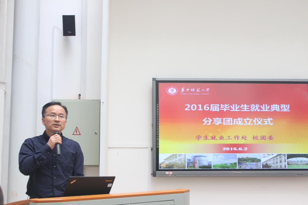 处长王茂胜首先致辞。他介绍,为了贯彻落实党中央国务院对做好高校毕业生就业工作的有关精神,引导广大毕业生树立正确的人生观、价值观和就业观,营造促进就业工作的良好氛围,今年,就业处与校团委合作,共同开展毕业生就业典型推荐活宣传活动,31名同学被评选为全校2016届毕业生就业典型。同时,以这31名同学为成员的就业典型分享团,将采取面对面“现身说法”的形式与在校学生进行成长成才、求职就业等方面的互动交流。王茂胜宣布分享团正式成立,并希望广大学子以获评就业典型的同学为榜样,树立合理的职业生涯发展目标,珍惜大学学习时光,以实际行动不断提升核心竞争力,努力练好人生和事业的基本功。