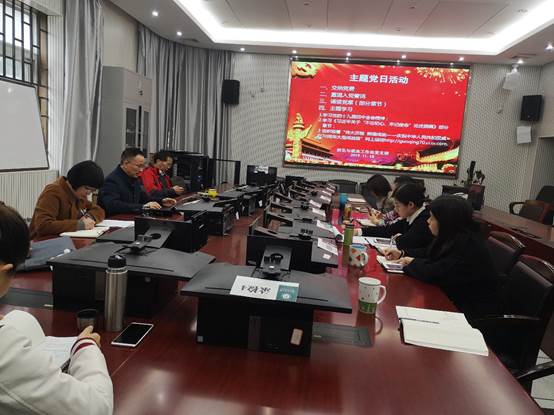 党支部11月份主题党日活动在B101开展。按照学校机关党委的要求,在现场缴纳11月份党费,重温入党誓词,学习党章章节后。主题学习了党的十九届四种全会精神、《习近平关于“不忘初心、牢记使命”论述摘编》中习近平关于扶贫的相关内容,组织观看了“伟大工程 辉煌成就——庆祝中华人民共和国成立70周年大型成就展”网上展馆。本次支部活动由支部书记王茂胜主持,全体党员参加了活动。