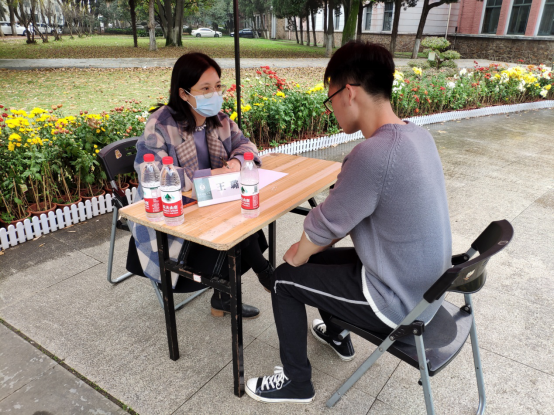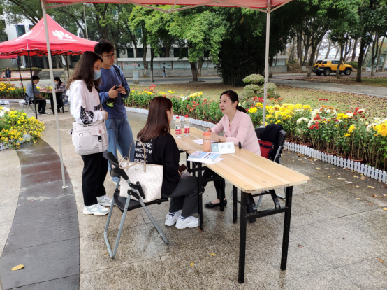 课间时段,更多同学闻讯赶来参加咨询,喷泉广场热闹起来,同学们或驻足在优秀求职简历、生涯规划书展示区观摩学习,或主动请咨询老师帮助自己解答生涯发展过程中遇到的困惑。现场的