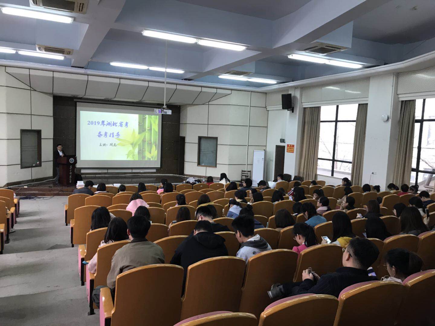 9号教学楼1楼报告厅举办了2019年湖北省考备考指南讲座。本次讲座由公共管理学院研究生会、城市与环境科学学院研究生会主办,携手社会学院研究生会、中国农村研究院研究生会协办。