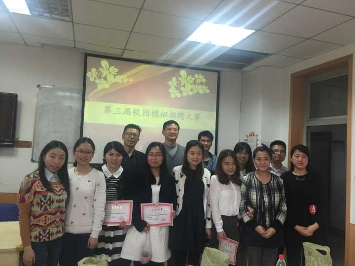 活动结束之际,本次招聘大赛获奖名单亦新鲜出炉。其中荣获本次招聘一等奖的是14级罗珍珍同学、二等奖由14级张立解同学摘获、15级王玲和14级王漫获得三等奖,14级尹文玉和15级曹义兵、15级杨铭宇、15级侯莹莹四位同学获得优秀奖,汪书记、万院长、翟老师分别为一二三等奖获得者颁奖,并合影留念,汪书记还为冠军获得者罗珍珍现场提字,鼓舞她继续努力 。