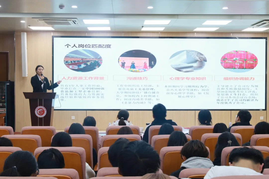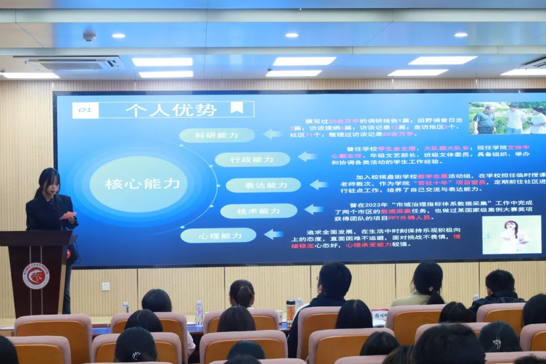 副处长朱军,信息管理学院辅导员、生涯咨询师、就业指导师、BCC生涯教练蒋可鸣,学院党委副书记肖微,辅导员李立、廖伟担任评委,2024级本科生现场观摩,比赛由2021级本科生王晨主持。